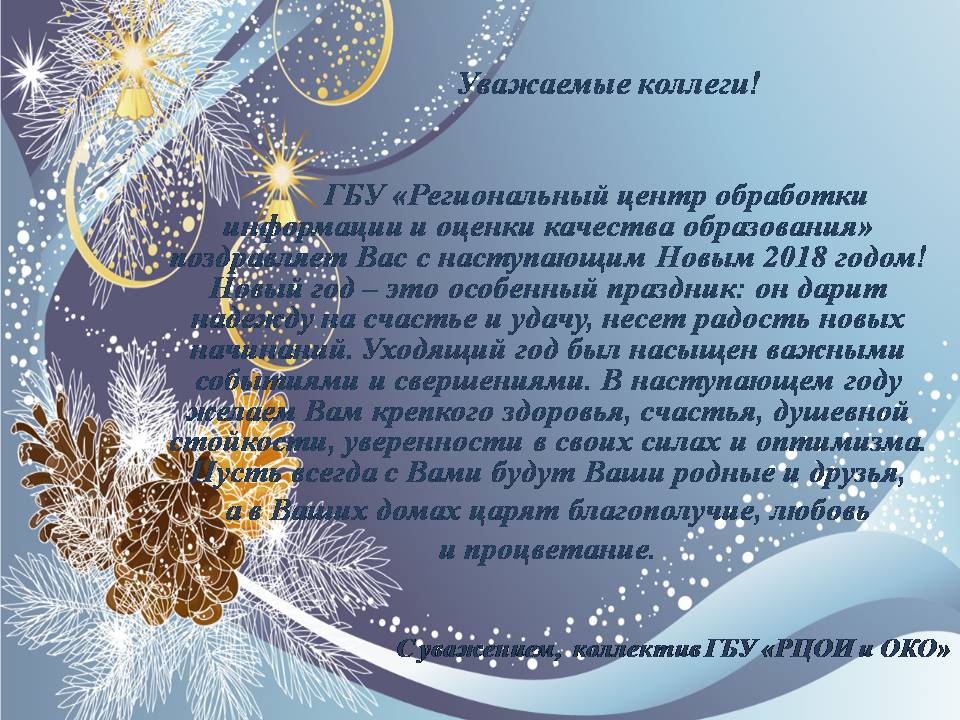 Коллектив ГБУ «Региональный центр обработки информации и оценки качества образования» поздравляет Вас с наступающим Новым 2018 годом! Новый год – это особенный праздник: он дарит надежду на счастье и удачу, несет радость новых начинаний. Уходящий год был насыщен важными событиями и свершениями. В наступающем году желаем Вам крепкого здоровья, счастья, душевной стойкости, уверенности в своих силах и оптимизма. Пусть всегда с Вами будут Ваши родные и друзья, а в Ваших домах царят благополучие, любовь и процветание.